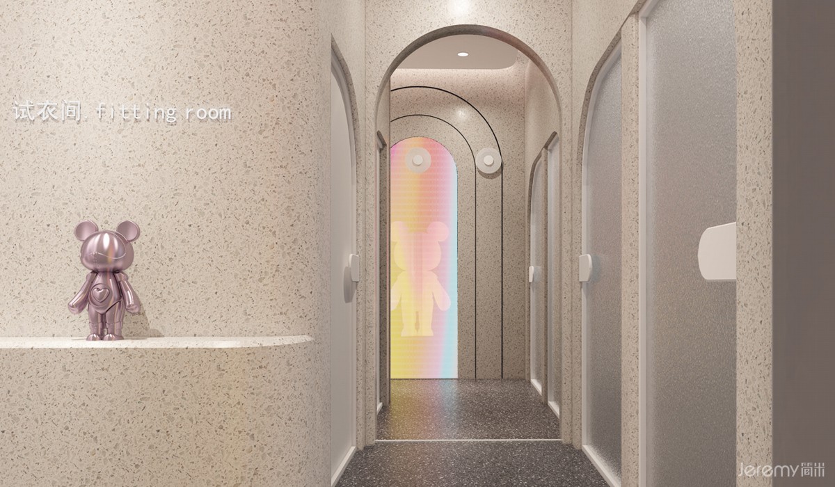 本案的店面空间设计旨在打造沉浸式潮流体验空间,在门店的入口处,设置了一个以星际熊和埃莉诗兔故事为背景的装置艺术,作为该品牌的主打卡点。星际熊能量补给舱等各式各样的ip公仔装置艺术和品牌产品陈列完美融合,组成赏心悦目的潮玩X潮服视觉盛宴,满足时尚达人们打卡欲望。试衣间以太空舱形式呈现,完美贴合星际熊太空使者的人设,也增强了消费体验的趣味性。
