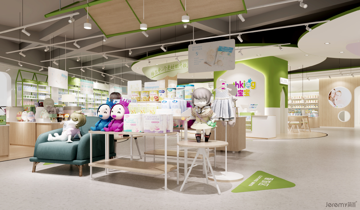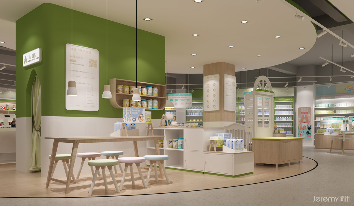新生代父母家庭购物需求转变,注重亲子互动以及开放性体验消费。终端店面设计更关注消费者的购物体验,以品牌亲情区为核心,打造温馨居家的氛围,把营销和服务的战线延展到体验上,给予丰富的互动交流以及多样选择。区域划分上主次分明,围绕品牌核心——亲情文化,打造“以亲情区为中心点、其他各区域环绕分布”的布局,以体验式产品陈列促进消费者的购买欲,提升消费者购物时的愉悦心情。